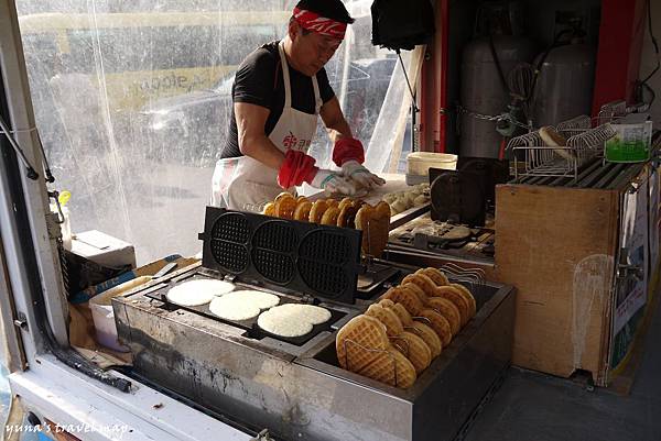 我們也買了一個, 是一種餅,裡面包焦糖~我是覺得還好,可能要見人見智 (最旁邊圓圓的那個,一個$1000韓幣)