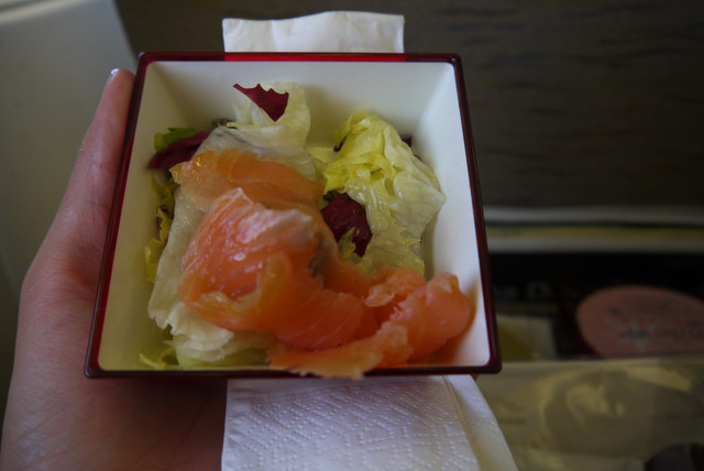▲飛機餐~跟以前的飛機餐比起來,真的是好吃很多,有沒有瞧瞧那鮭魚沙拉!! 是鮭魚優~~超好吃滴!!!!!