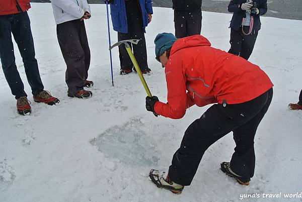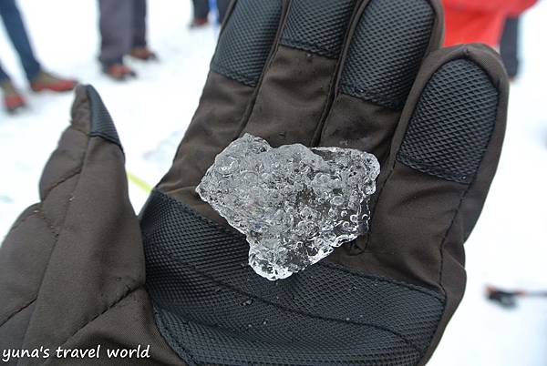 不過可不是冰原上的冰都可以直接拿起來吃,導遊是把冰原表層下的冰塊敲碎給大夥品嚐~