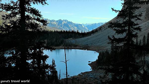 一開始看Tower Lake其實沒有甚麼感覺,但直到要爬到Rockbound Lake 的路上偶然一回頭看到群山下的Tower Lake