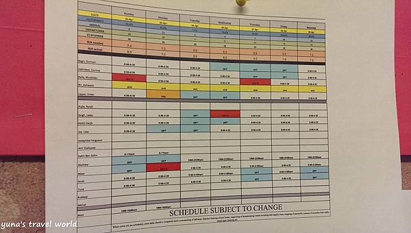 ▲ 跟其他飯店一樣,每周四會排下周的班表出來,基本上是每人一周休2天, 若是當周住房率不高有時會變成一周休3天~
