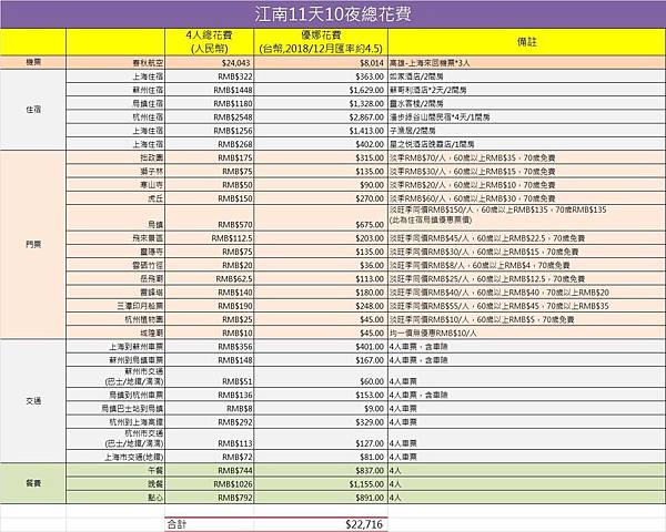 總花費一人平均下來大約RMB$3033,約台幣NT$13649(2018/12月匯率為4.5),加上機票一人大約$22000左右