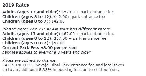 不過2019年的票價如上,除了11:30那場的tour價格是US$67(per person)外,其餘時間都是US$52(per person),還要再另外加上US$8的國家公園入場費