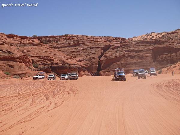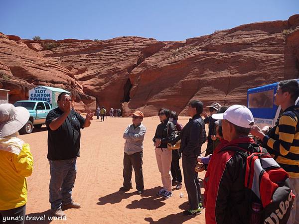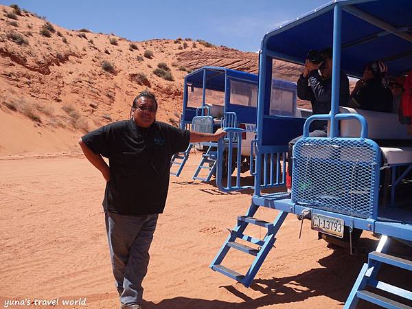 ▲後面藍色的就是我們當時搭乘的接駁車~~很可愛吧 ❤ ❤ 每台車上都會有一個當地人導遊,一路上會簡單介紹羚羊峽谷的歷史和簡介